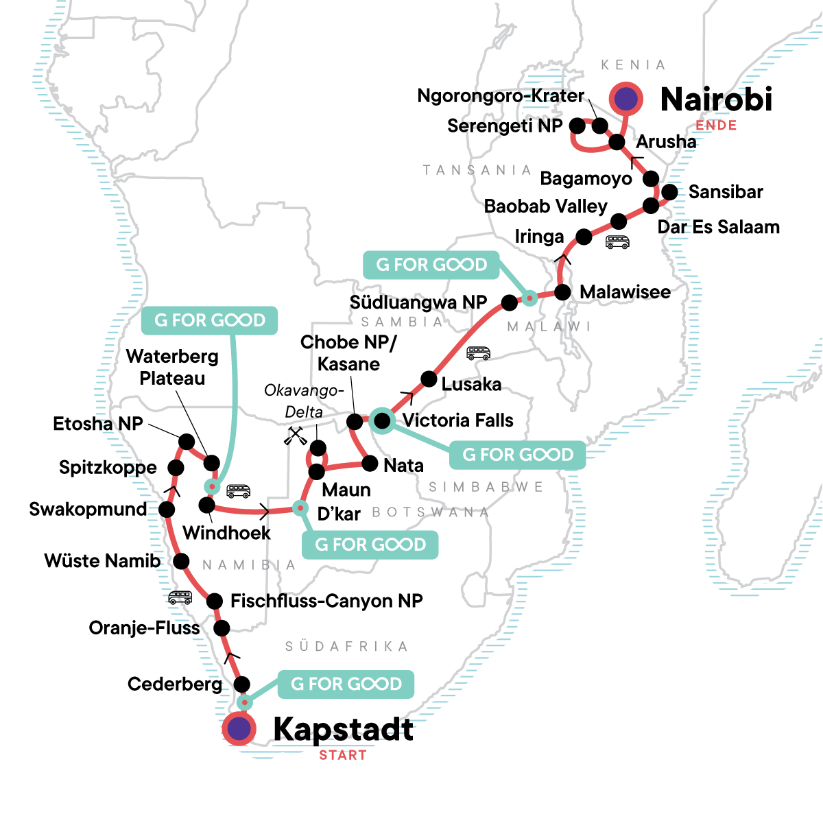 Dein Local-Living-Moment: Abendessen in Kande Beach, Kande Beach. Entrance to Fish River Canyon, Sossusvlei Dunes, and Spitzkoppe. Entrances and wildlife safari drives in Etosha and Serengeti National Parks and in Ngorongoro Crater. Waterberg Plateau visit. Okavango Delta overnight bush camping excursion. Guided tour of spice plantation (Zanzibar). 3-day Zanzibar excursion. All transport between destinations and to/from included activities