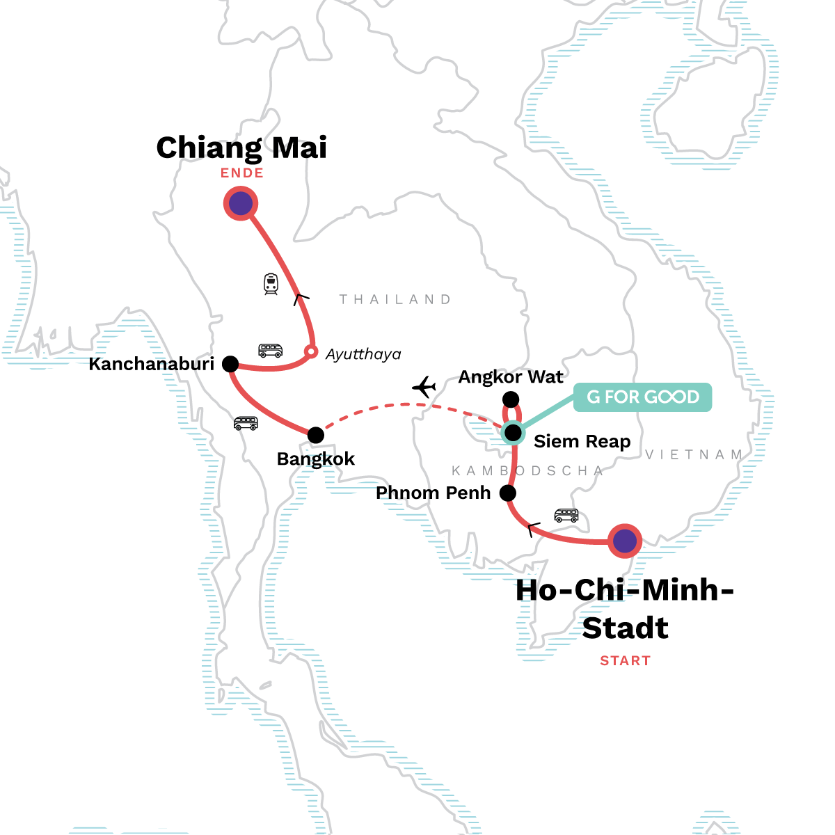 Uralte Ruinen, faszinierende Kulturen und pulsierende Metropolen erwarten dich auf dieser 15-tägigen Erlebnisreise durch Vietnam, Kambodscha und Thailand. Besuche mit einem einheimischen Führung Angkor Wat bei Sonnenaufgang, mache eine Bootsfahrt durch die Kanäle von Bangkok und erkunde historische Stätten in der alten Hauptstadt des ehemaligen Königreichs Ayutthaya. Und dazwischen hast du reichlich Gelegenheiten, bei Übernachtungen bei Gastfamilien die Einheimischen und die traditionellen Kulturen in den Dörfern kennenzulernen. Danach hast du dir die Stempel in deinem Reisepass redlich verdient.