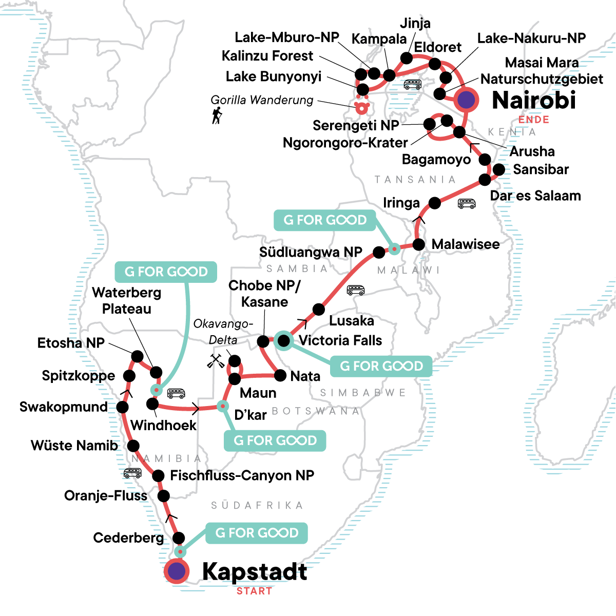 Erlebe Afrika jetzt mit uns auf deine Weise mit diesem erschwinglichen Trip speziell für junge Reisende! 55 Tage klingen vielleicht lang, aber wenn du erst mal im Südosten Afrikas bist, wirst du sehen, dass das nur der Flügelschlag einer Libelle ist angesichts all der epischen Landschaften, seltenen Tiere und besonderen Menschen hier. Verfolge die "Big Five" durch die offene Savanne, erkunde das Okavango-Delta in einem traditionellen Mokoro-Einbaum, begegne Berggorillas tief in der Wildnis Ugandas und bekomme ein Gefühl dafür, wie grandios Afrika wirklich ist. In unserem Overland-Abenteuer-Vehikel, dem Lando, bist du ganz komfortabel unterwegs und beim Zelten in der Wildnis erlebst du die Tierwelt der Region aus nächster Nähe. Die Zeit wird wie im Flug vergehen, wetten?